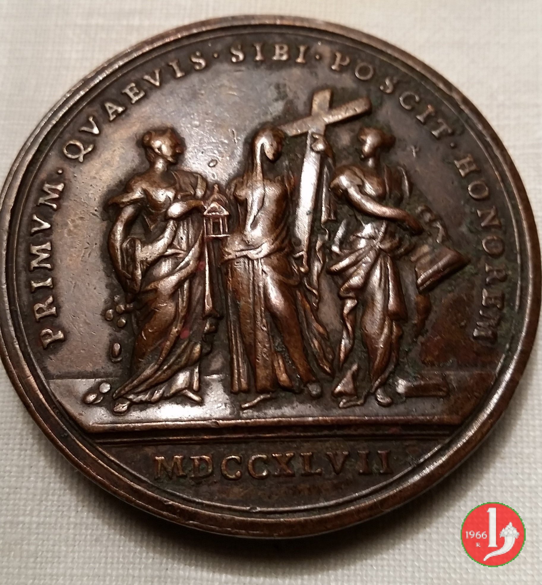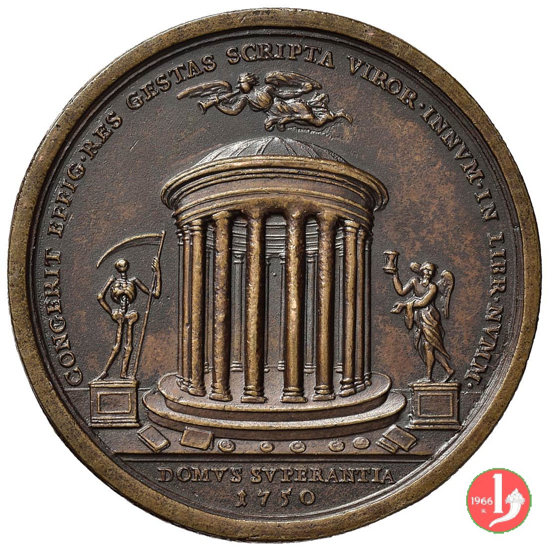 Verso: nel campo su 10 righe: BIBLIOTHECAE = A SE ERECTAE = DOTATAEQVE = COMMODO VRB • BRIX = PRIMARIO HVIVS = MAGISTRATVI = POSSESSIONEM = CONTRADIDIT = ANNO IVBIL. = MDCCL.