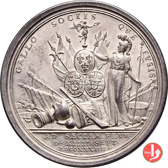 Verso: nel campo, tra ornati: REPRESSA = PYRATICA AVDACIA = SENATVS CONSVLTVS = CAP • IO • VALERIANVM = AMBATTI = ORNAVIT = 1749