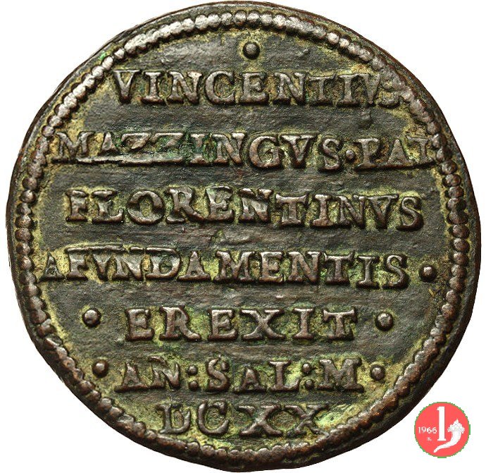 Verso: nel campo: • = VINCENTIVS = MAZZINGVS PAT = FLORENTINVS = A FVNDAMENTIS • = • EREXIT • = AN : SAL : M • = DCXX
