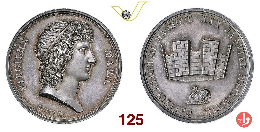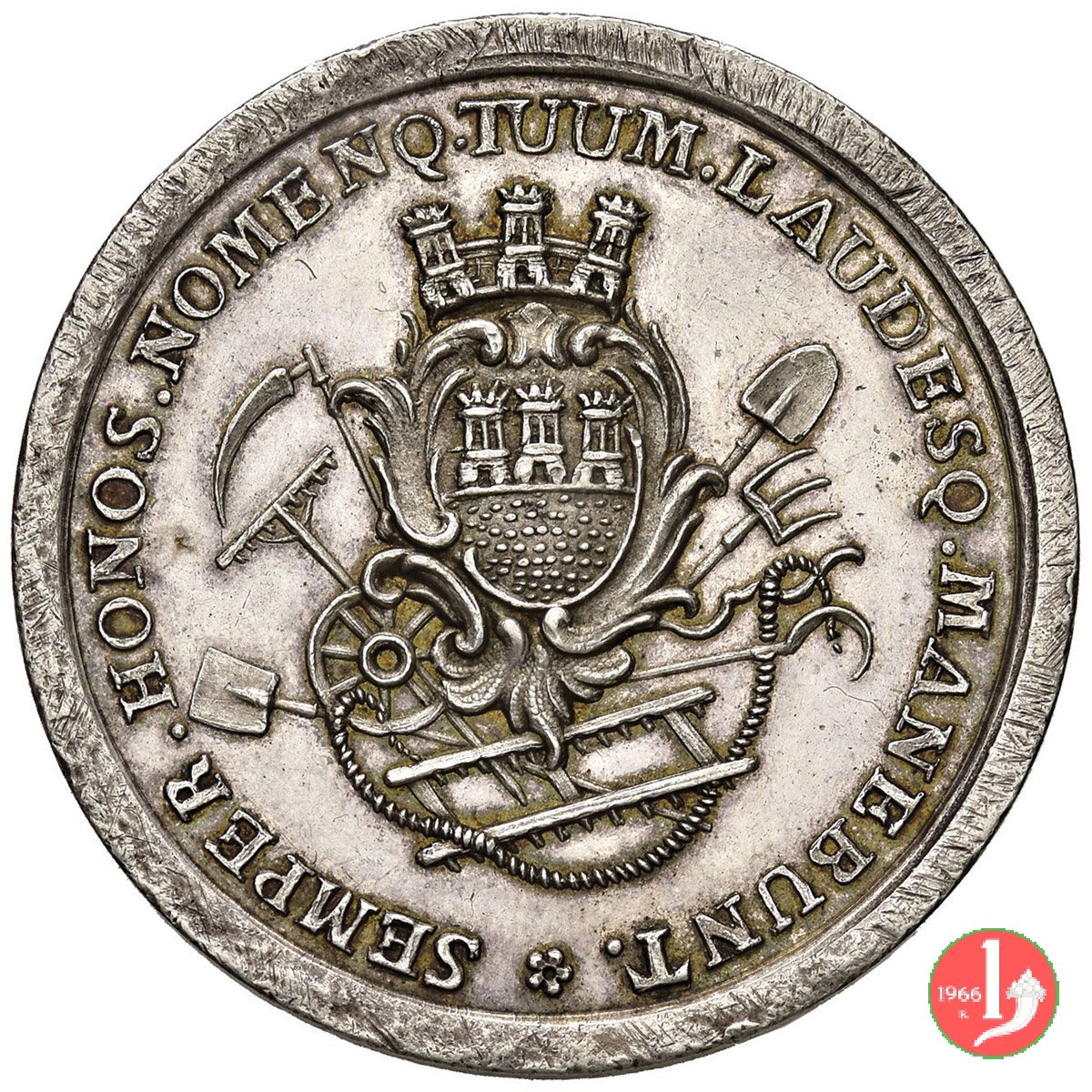 Obverse: Figura allegorica di Mantova turrita, consegna le chiavi della città a Marte; sul fondo ponte e a dx fortificazione