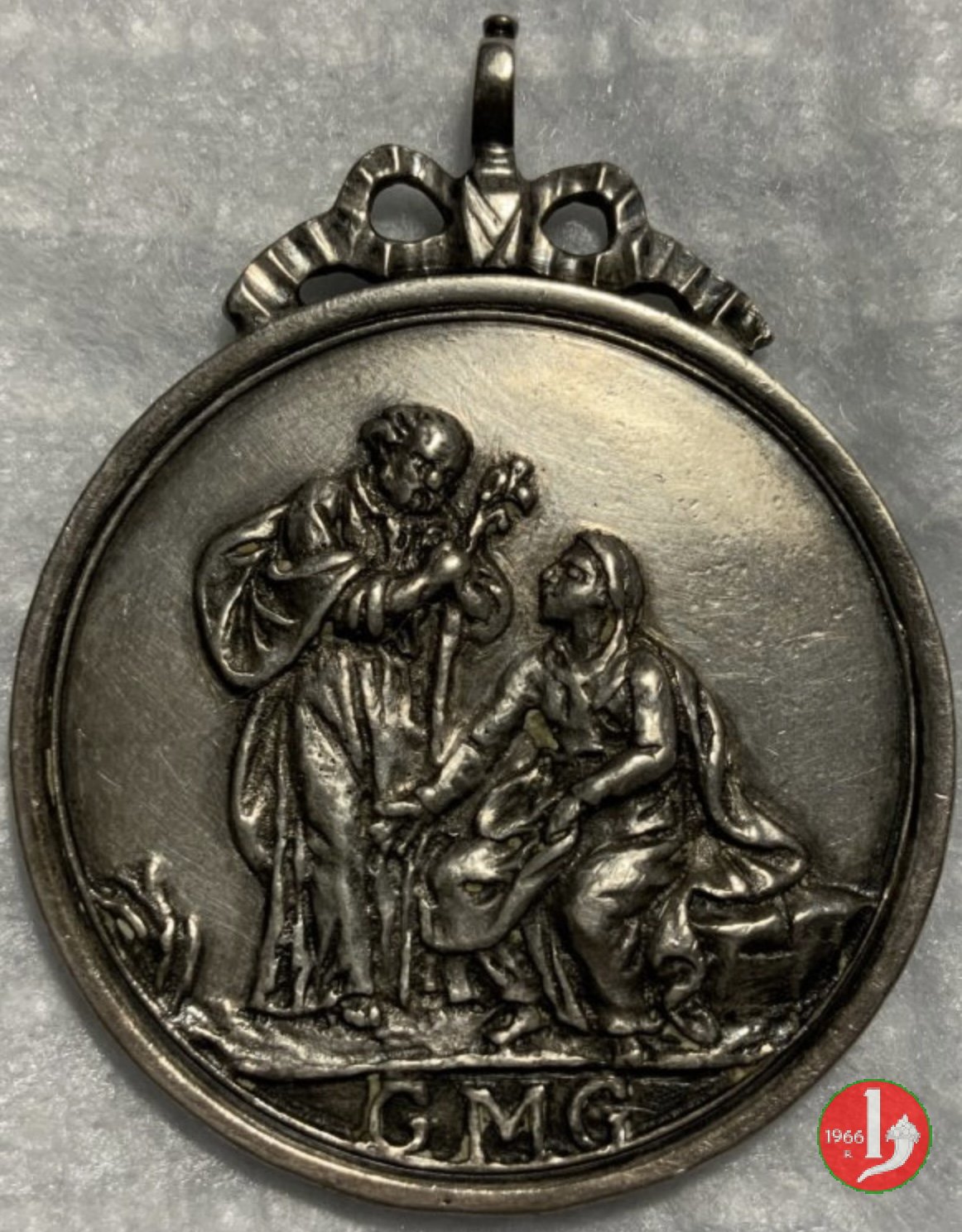 Obverse: La Madonna della Misericordia, ritta in piedi, apre le braccia per accogliere sotto il suo mantello due devoti confratelli della Scuola della Misericordia che le si rivolgono in ginocchio