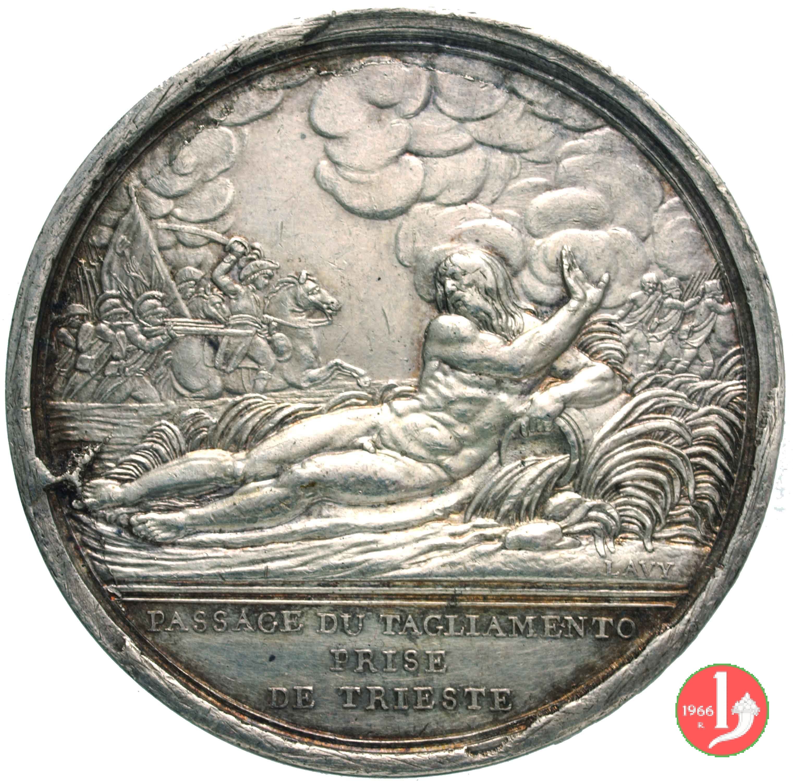 Obverse: Figura allegorica del Fiume Tagliamento, distesa verso sx, versa acqua da orcio ed è impaurito dall'esercito Francese che avanza da sx