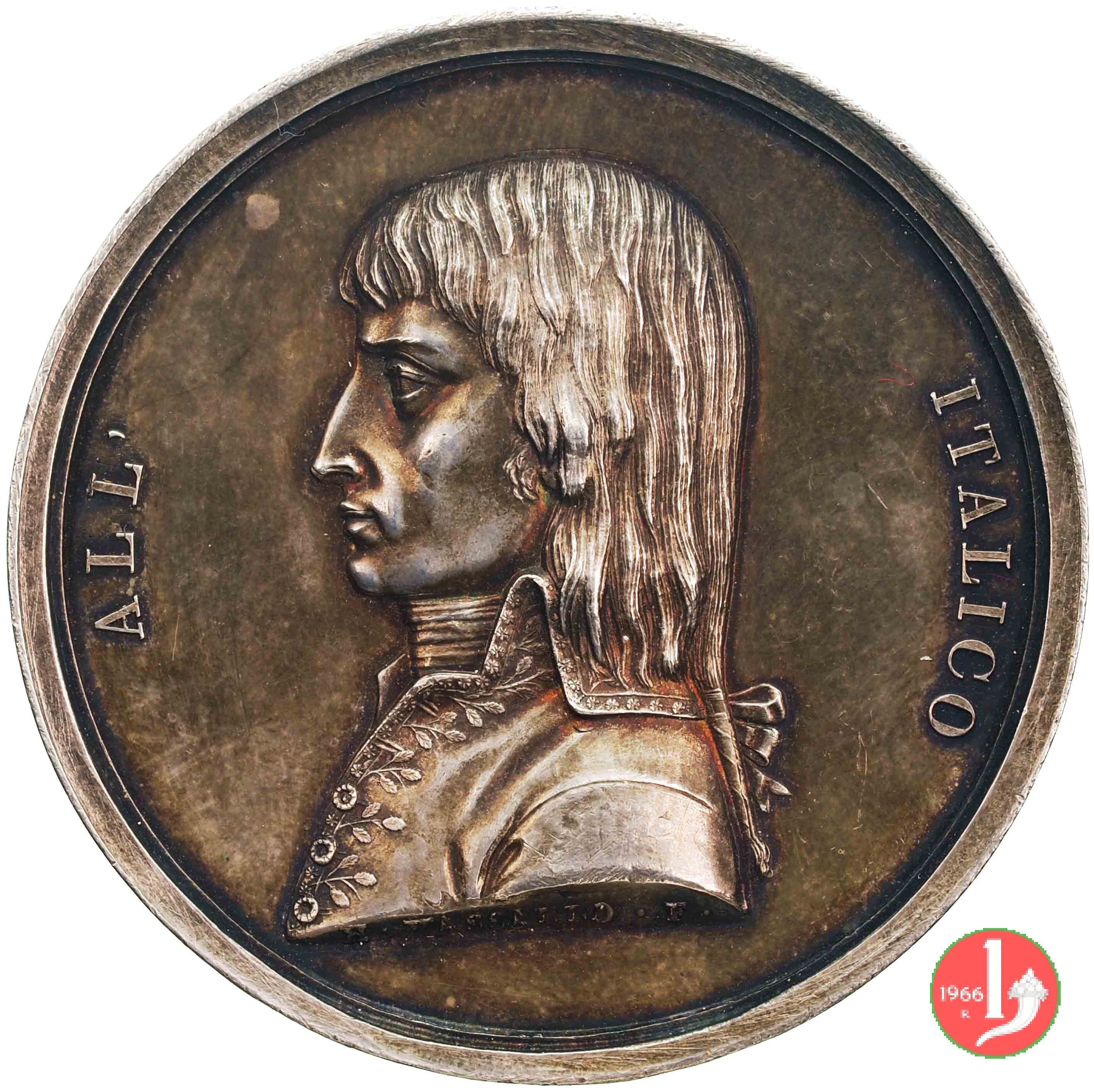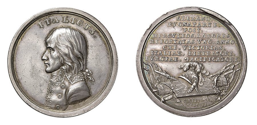 Reverse: nel campo, in alto: ALEXAND. = BVONAPARTE. = POST. = HERCVLEOS. LABORES. = REPORTATAS. VNO. ANNO. = CXI. VICTORIAS. = ITALIAE. LIBERATORI. = EVROPEAE. PACIFICATORI.