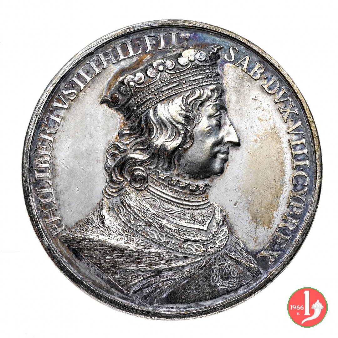 Filippo II 1496-1497 -UdS56 Dritto: PHILIPPVS • II LVD • FIL • SAB • DVX • VII • CYP • REX busto a dx con berretto, colletto alla spagnola e collare della SS. Annunziata con FERT sul contorno sul taglio spalla: LAVY figura femminile turrita, allegorica di Torino, in piedi, volta a sx, regge scudo e porge corona a Filippo II; sullo sfondo arco trionfale e la città fortificata | |