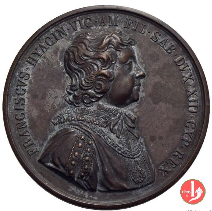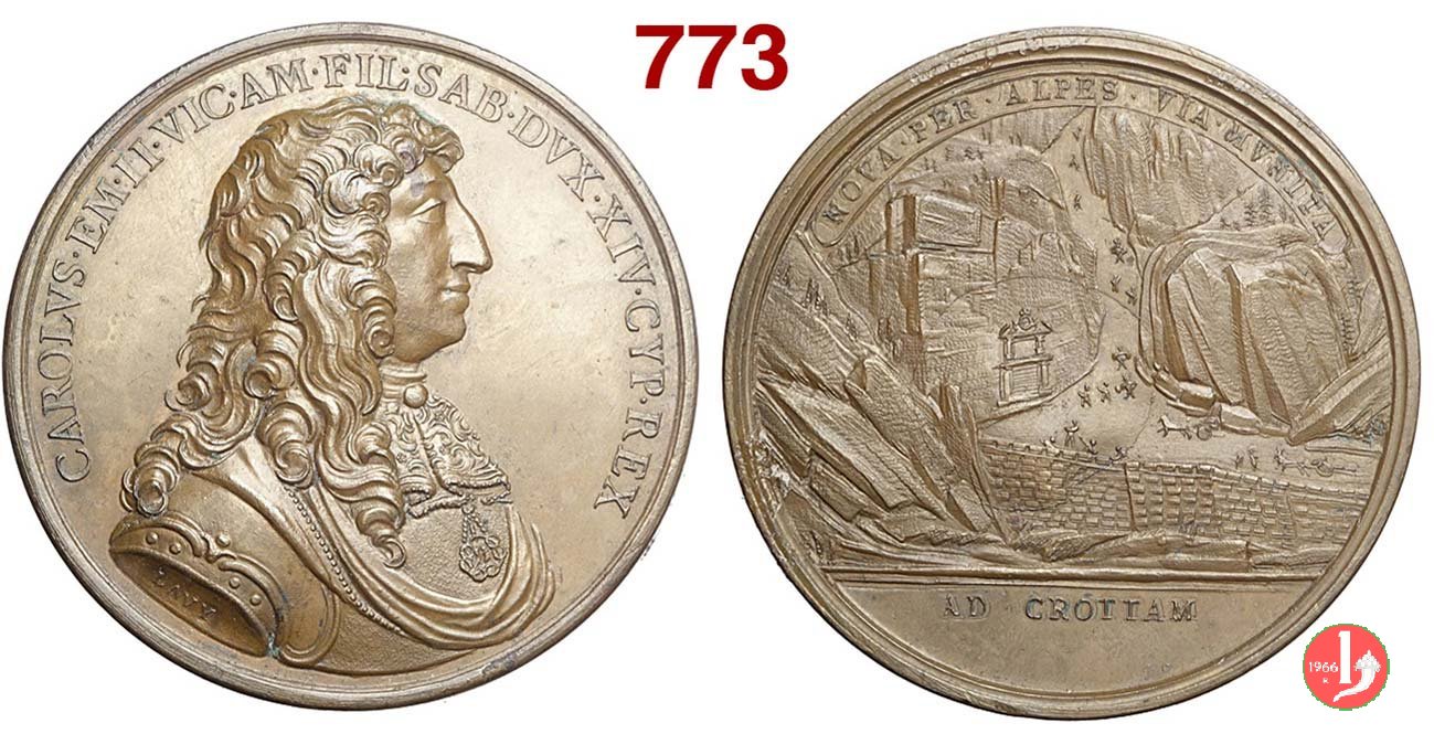 Carlo Emanuele II 1638-1675 -UdS71 Dritto: CAROLVS • EM • II • VICAM • FIL • SAB • DVX • XIV • CYP • REX busto corazzato a dx con collare della SS. Annunziata e bavero ricamato sul taglio spalla: LAVY Vista dei lavori di costruzione e restauro della Strada del Moncenisio in esergo: IN GROTTAM | |