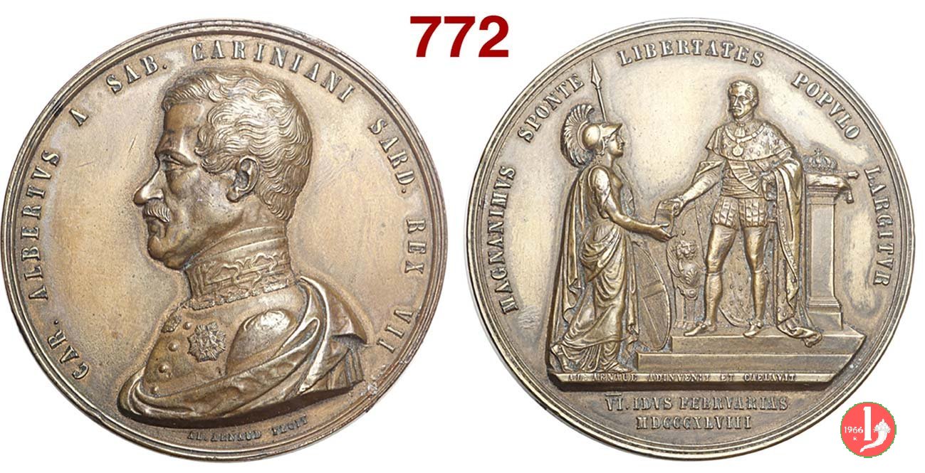 Carlo Alberto 1831-1849 -UdS88 Dritto: CAR • ALBERTVS • A • SAB • CARIGNANI SARD. REX • VII busto paludato a sx con uniforme e collare della SS. Annunziata sotto: AL. ARNAVD FECIT Carlo Alberto in piedi, presso trono e base con corona, porge pergamena a Minerva paludata ed elmata sulla linea dell'esergo: AB • ABNAULD ADINVENIT ET CAELAVIT in esergo: VI • IDVS • FEBRVARIAS = MDCCCXLVIII | |