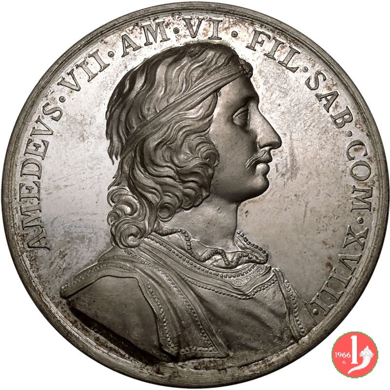 Amedeo VII il Rosso 1383-1391 -UdS43 Dritto: AMEDEVS • VII • AM • VI • FIL • SAB • COM • XVIII • busto a dx con nastro a fermare i capelli e abito con bordatura perlinata sul taglio spalla: LAVY scena allegorica della resa dell'Austria: la figura allegorica dell'Austria regge scudo con Aquila genuflessa, verso sx, verso Amedeo VII corazzato ed elmato in piedi che regge lancia sullo sfondo: collina e imbarcazione in mare | |