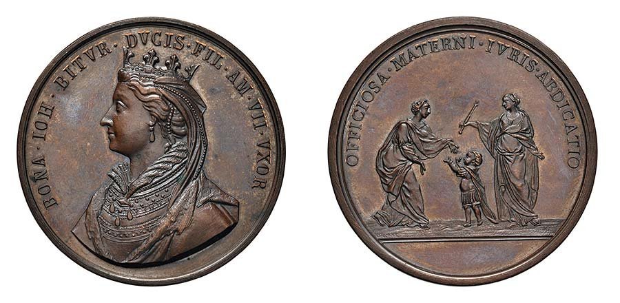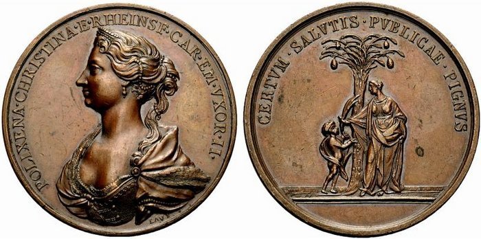 Polissena Cristina d'Assia -UdS78 Dritto: POLIXENA • CHRISTINA • E • RHEINSE • CAR • EM • VXOR • II • busto a sx con abito ricamato e manto di pelliccia sotto: LAVY figura femminile, in piedi, a sx, porge ramo di palma a fanciullo | |