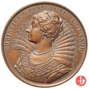 Cristina di Francia -UdS69 Dritto: CHRISTINA • A • FRANCIA • VIC • AM • I • VXOR busto a sx con ampio colletto ricamato, capelli raccolti da filo di perle e collana di perle sul taglio spalla: LAVY | |