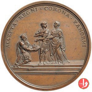 Anna Maria d'Orleans -UdS75 Dritto: ANNA • MARIA • AVRELIAN • VIC • AM • II • VXOR • busto a sx con mantello sul taglio della spalla: LAVY Re genuflesso, allegorico della Città di Palermo, offre corona a Vittorio Amedeo II e ad Anna Maria | |