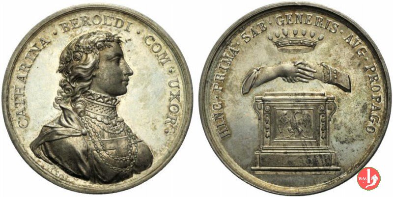 Caterina di Sciren -UdS2 Dritto: CATHARINA • BEROLDI • COM • UXOR • busto a dx con ghirlanda di fiori tra i capelli sul taglio spalla: LAVY Ara con aquila ad ali spiegate, sopra l'ara due mani coronate si stringono | |