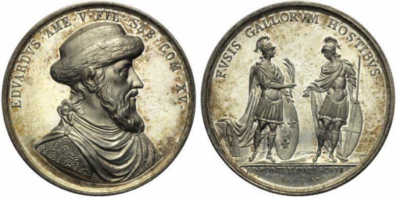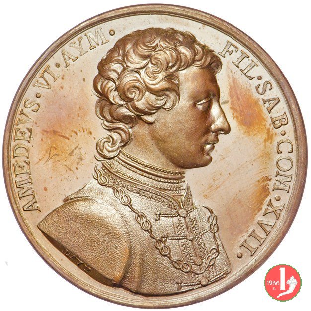Amedeo VI 1343-1383 -UdS41 Dritto: AMEDEVS • VI • AYM • _ FIL • SAB • COM • XVII • busto a dx con giubba e collare di nodi d'amore sul taglio spalla: LAVY figura allegorica in piedi e di fronte, in abiti orientali, tra due guerrieri paludati, porge spada | |