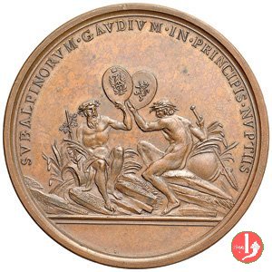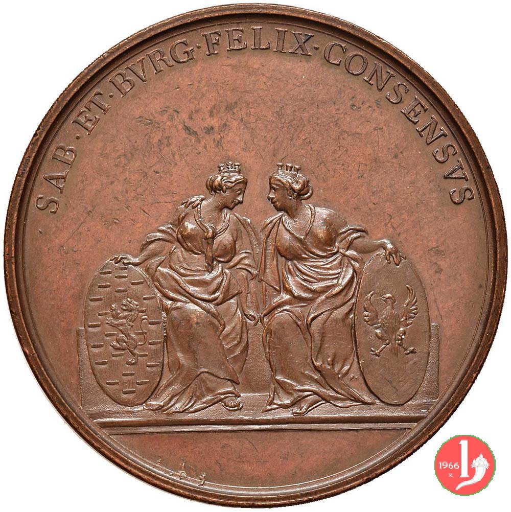 Elisabetta Teresa di Lorena -UdS79 Dritto: ELIZABETHA • THIER • E • LOTH • CAR • EM • VXOR • III • busto a sx con abito ricamato e mantello sul taglio spalla: LAVY Carlo Emanuele stringe la mano a Elisabetta Teresa, in basso amorini recano scudi delle famiglie Savoia e Lorena | |