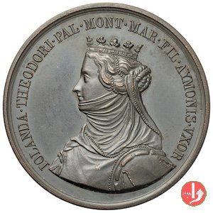 Jolanda di Monferrato -UdS40 Dritto: IOLANDA • THEODORI • PAL • MONT • MAR • FIL • AYMONIS • VXOR busto a sx con velo e corona sul taglio del busto: LAVY entro ghirlanda floreale: quattro stemmi al centro: SECVLI = ORNAMENTVM | |