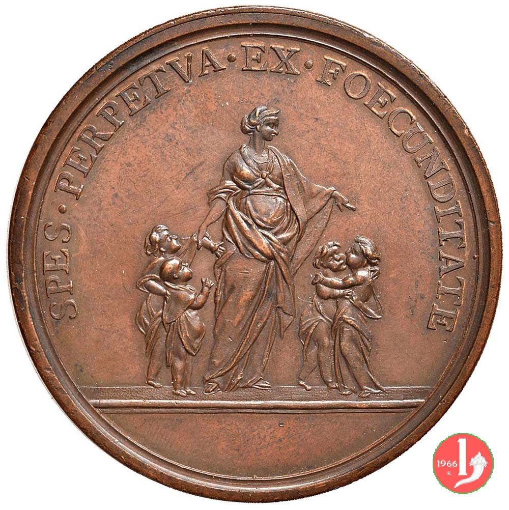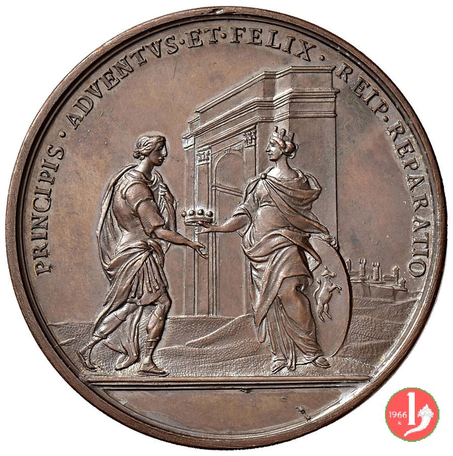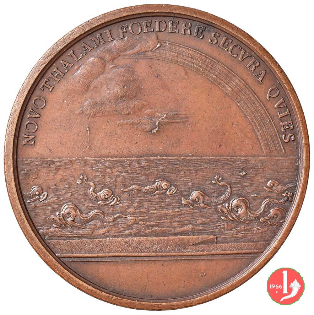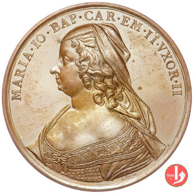 Maria Giovanna Battista -UdS73 Dritto: MARIA • IO • BAP • CAR • EM • II • VXOR • II busto velato a sx con abito ricamato sotto: LAVY figura femminile allegorica, in piedi , di fronte, tra due ceste di spighe e grano, sullo sfondo albero di frutta e poppa di nave | |