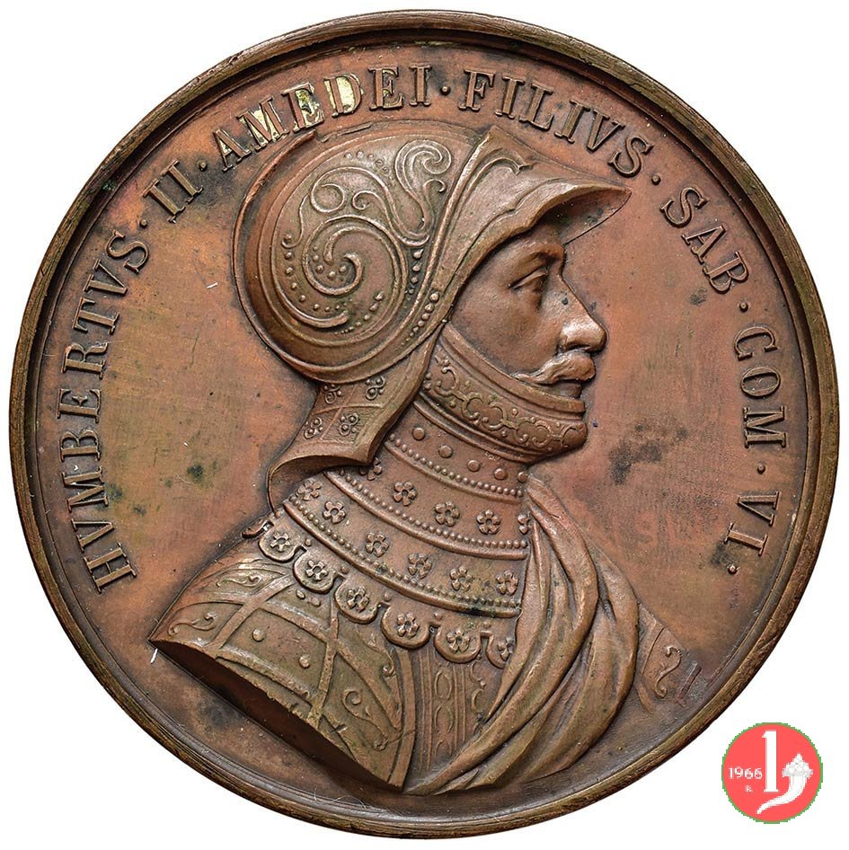 Umberto III il Santo 1148-1189 -UdS17 Dritto: HVMBERTVS • III • AMEDEI • FIL • SAB • COM • VIII • busto a dx con berretto, mantello teso da fermaglio con nodi d'amore e camicia ornata sul taglio spalla: LAVY Umberto III seduto a dx, su un cippo, riceve gli omaggi del Marchese di Saluzzo genuflesso | |