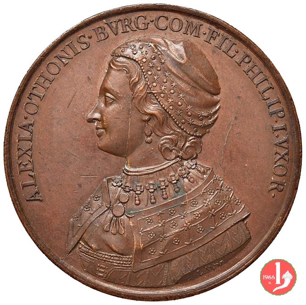 Alice di Borgogna -UdS32 Dritto: D' ALEXIA • OTHONIS • BVRG • COM • FIL • PHILIP • I • VXOR • busto a sx con copricapo ricamato, collana e mantello ricamato sul taglio spalla: LAVY due figure femminili sedute a fianco , turrite e con scudi con Stemmi Borgogna e Savoia | |