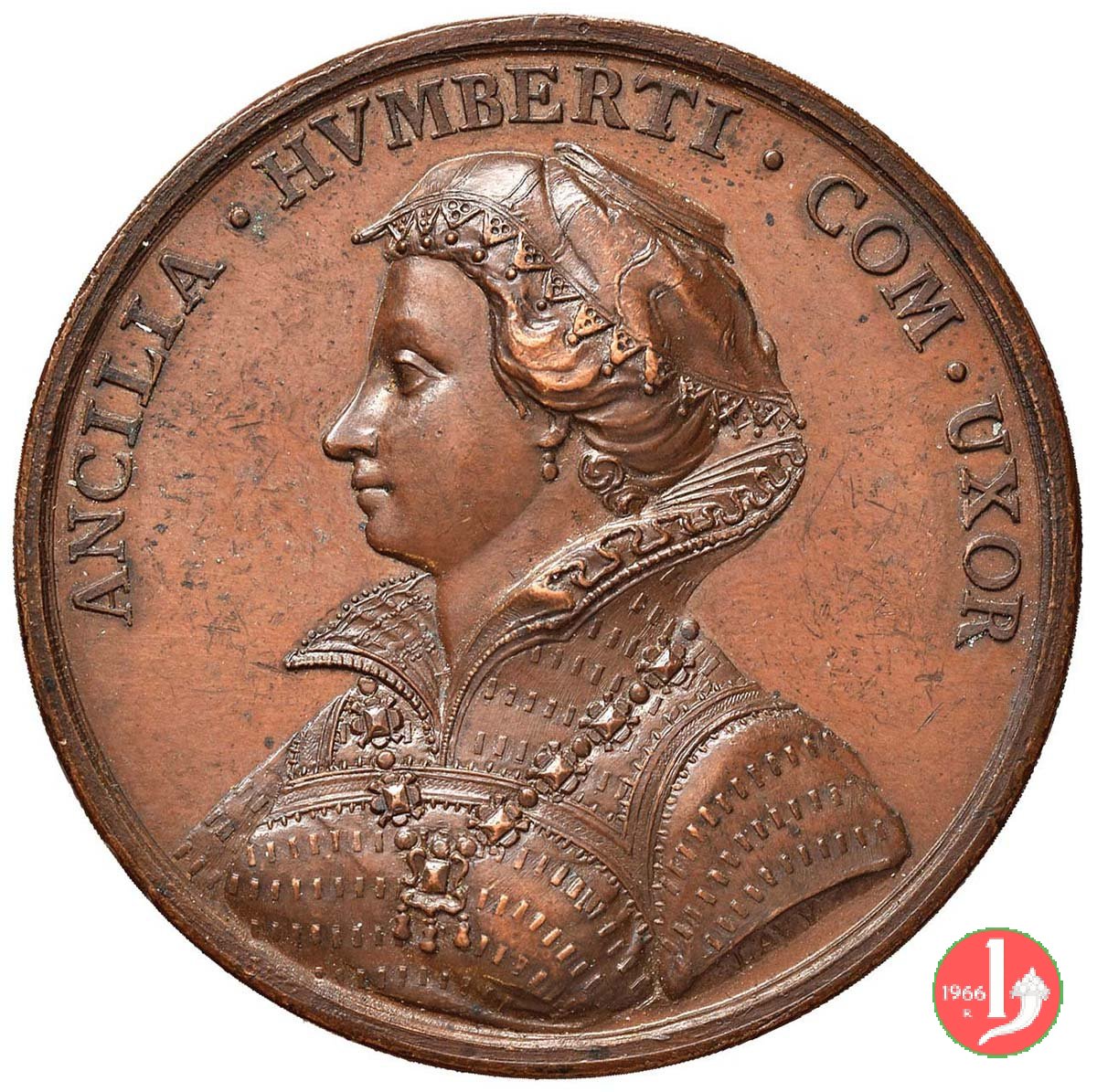Ancilia -UdS4 Dritto: ANCILIA • HVMBERTI • COM • UXOR busto a sx con cuffia ed abito ricamato sul taglio spalla: LAVY la figura allegorica della Speranza, in piedi, volta a dx, con ai lati quattro fanciulli | |