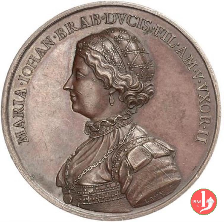 Jolanda o Violante di Francia -UdS50 Dritto: IOLANTA • CAR • VII • FR • REGIS • FIL • AM • IX • VXOR busto a sx con cappello, collana e mantello sul taglio spalla: LAVY figura allegorica femminile in piedi a dx regge lancia; a sx cippo con tre gigli di Francia | |