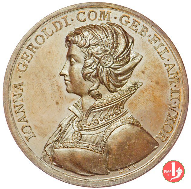 Giovanna di Ginevra -UdS10 Dritto: IOANNA • GEROLDI •COM • GEB • FIL • AM • II • VXOR busto a sx con copricapo ed abito ricamato sotto: LAVY Ercole lotta con leone | |