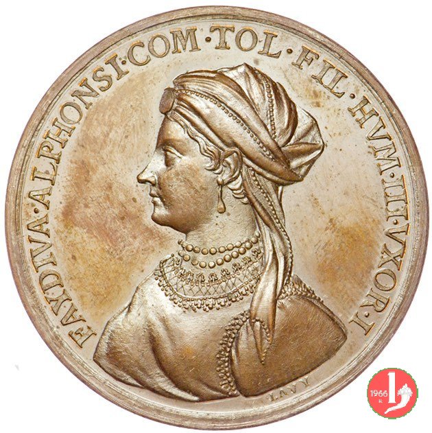 Faidiva di Tolosa -UdS18 Dritto: FAYDIVA • ALPHONSIS • COM • TOL • FIL • HVM • III • VXOR • I busto a sx con turbante perlinato e abito con bordature in pizzo sotto: LAVY figura muliebre velata, in piedi, di fronte e volta a sx, regge pergamena in esergo: IN • ECCL • VLCIENSEM | |