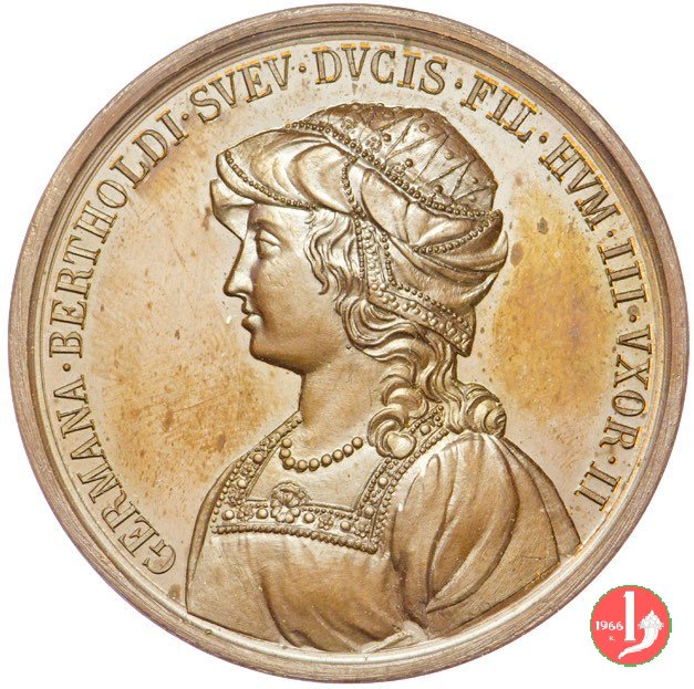 Clemenza Germana di Zeringen -UdS19 Dritto: GERMANA • BERTHOLDI • SVEV • DVCIS • FIL • HVM • III • VXOR • II busto a sx con cuffia e abito ricamati Aquila ad ali spiegate e leone disteso presso albero d'ulivo | |