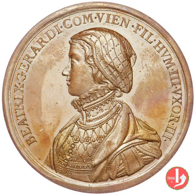 Beatrice di Borgogna -UdS21 Dritto: BEATRIX • GERARDI • COM • VIEN • FIL • HVM • III • VXOR • III • busto a sx con berretto, corpetto ornato da rete di perle e mantello Angelo, in piedi, volto a dx, protende serto d'alloro su bambino adagiato su letto | |