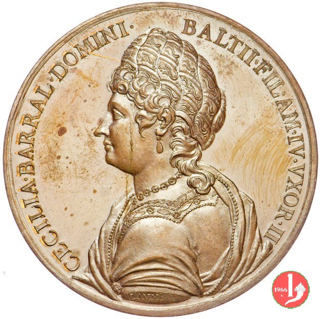 Cecilia del Balzo -UdS27 Dritto: CECILIA • BARRAL • DOMINI • _ BALTII • FIL • AM • IV • VXOR • II busto a sx con cuffia ricamata, veste ornata