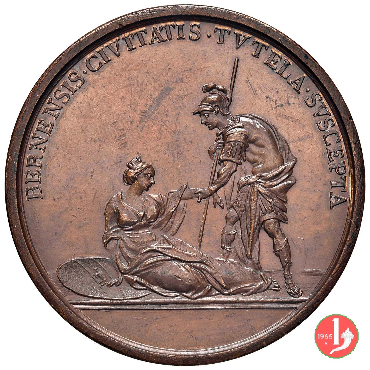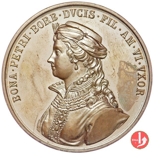 Bona di Borbone -UdS42 Dritto: BONA • PETRI • BORB • DVCIS • FIL • AM • VI • VXOR busto a sx con cappello, camicia e giubba ornata due figure femminili con fanciullo al centro | |