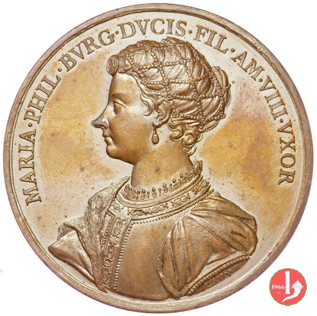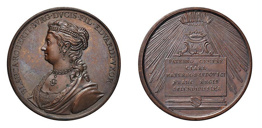 Bianca di Borgogna -UdS38 Dritto: BLANCA • ROBERTI • BVRG • DVCIS • FIL • EDVARDI • VXOR • busto a sx con capelli raccolti sul capo con trecce e fermati sul davanti, collana e mantello ornato da pelliccia sotto la spalla: LAVY in basso, sulla base: Stemma gentilizio | |