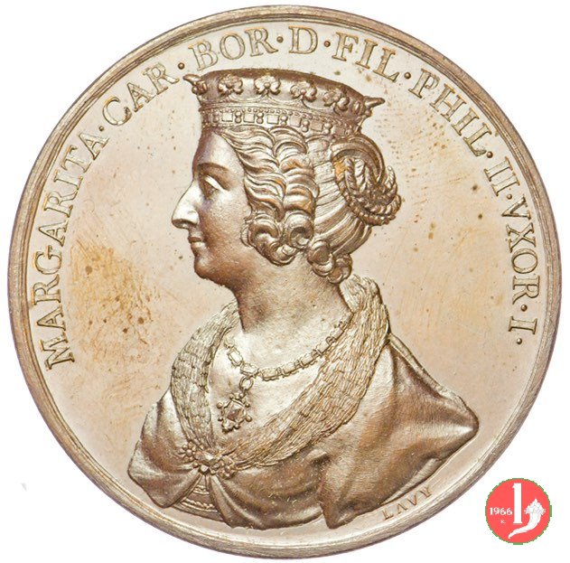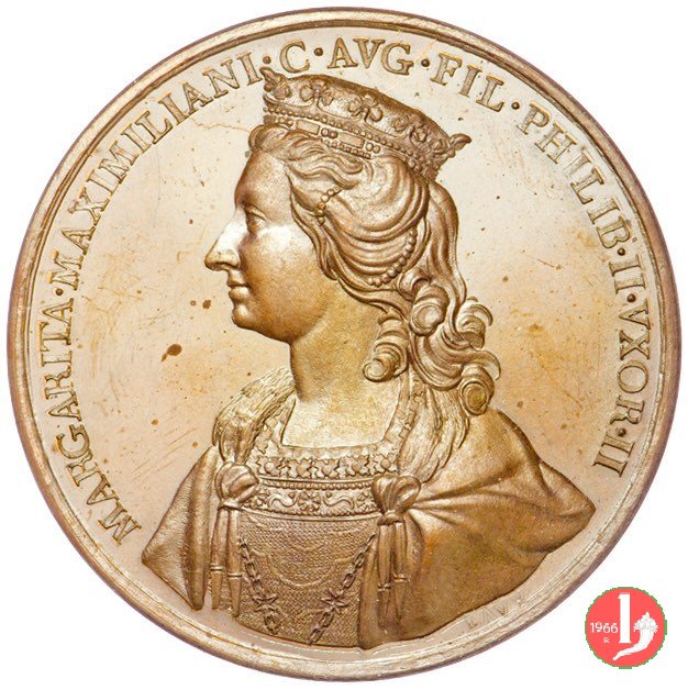 Margherita d'Austria -UdS61 Dritto: MARGARITA • MAXIMILIANI • C • AVG • FIL • PHILIB • II •VXOR • II busto coronato a sx con mantello e abito riccamente ornato sotto la spalla: LAVY | |