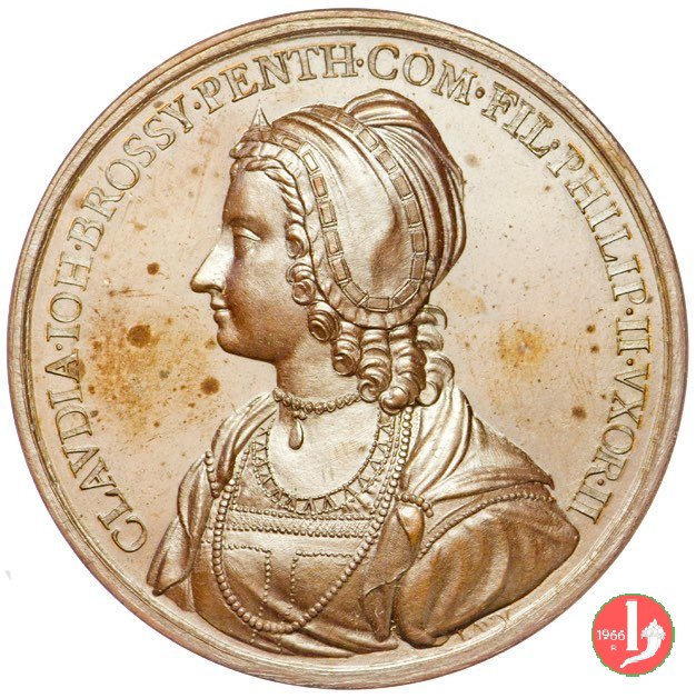 Claudia di Brosse di Bretagna -UdS58 Dritto: CLAVDIA • IOH • BROSSY • PENTH • COM • FIL • PHILIP • II • VXOR • II busto a sx con cuffia, girocollo, collana di perle e mantello sotto la spalla: LAVY La Duchessa genuflessa presso altare | |