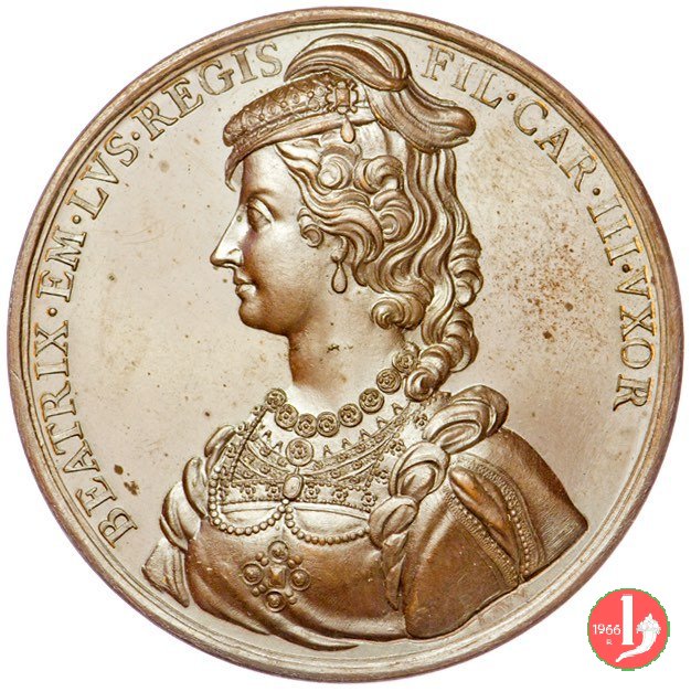Beatrice del Portogallo -UdS63 Dritto: BEATRIX • EM • LVS • REGIS _ FIL • CAR • III • VXOR busto a sx con berretto, collana e pendente sotto la spalla: LAVY Carlo V incontra la Duchessa, sullo sfondo tre paggi, a dx la città di Bologna | |