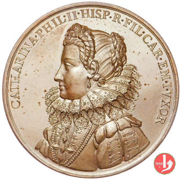 Caterina di Spagna -UdS67 Dritto: CATHARINA • PHIL • II • HISP • R • FIL • CAR • EM • I • VXOR busto a sx con abito ricamato e colletto in pizzo ondulato alla Spagnola e pendente a Croce sotto la spalla: LAVY La Duchessa, accompagnata da guerriero, riceve tre uomini | |