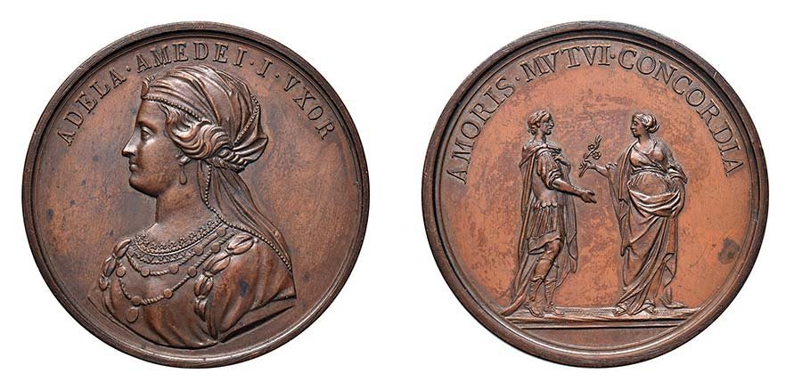 Adela di Borgogna -UdS6a Dritto: ADELA • AMEDEI • I • VXOR busto velato a sx con abito ricamato sul taglio spalla: LAVY figura muliebre in piedi, volta a sx, offre fiore a guerriero | |