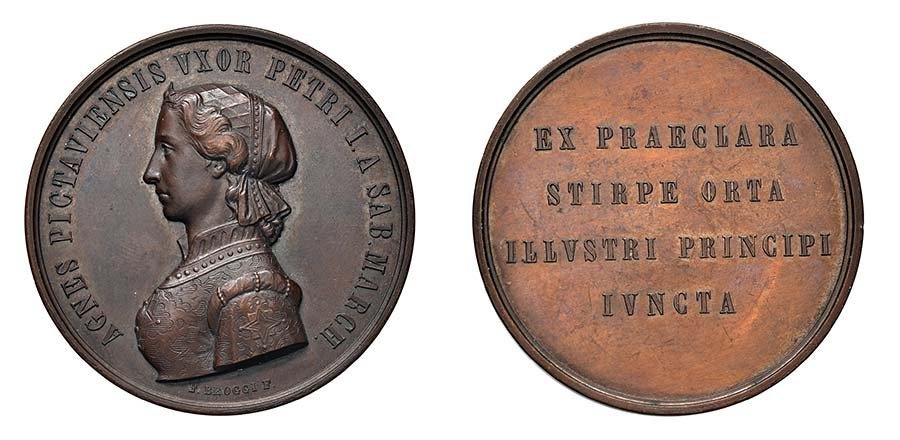 Agnese di Poitiers -UdS12 Dritto: AGNES PICTAVIENSIS VXOR PETRI I • A SAB • MARCH • busto a sx con cuffia a rete e veste ricamata sotto: F. BROGGI F. | |