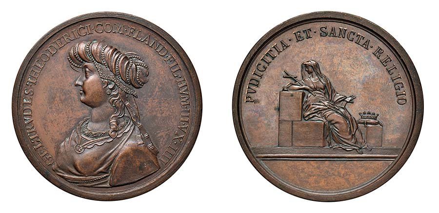 Gertrude d'Alsazia -UdS20 Dritto: GERTRVDES • THEODERICI • COM • FLAND • FIL • HVM • III • VX • IIII busto a sx con turbante perlinato e abito ricamato sul girocollo figura femminile su cippo regge Croce; su altro cippo corona su cuscino | |