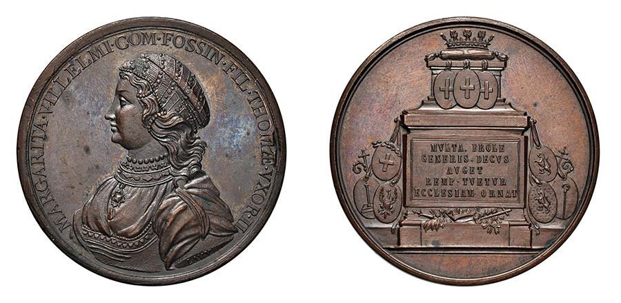 Margherita di Facigny -UdS24a Dritto: MARGARITA • VILLELMI • COM • FOSSIN • FIL • THOMAE • VXOR • II busto a sx con berretto ricamato e veste ornata sul taglio spalla: LAVY sull'ara: MVLTA • PROLE = GENERIS • DECVS = AVGET = REMP • TVETVR = ECCLESIAM • ORNAT ai lati: tre scudi ovali e pastorali | |