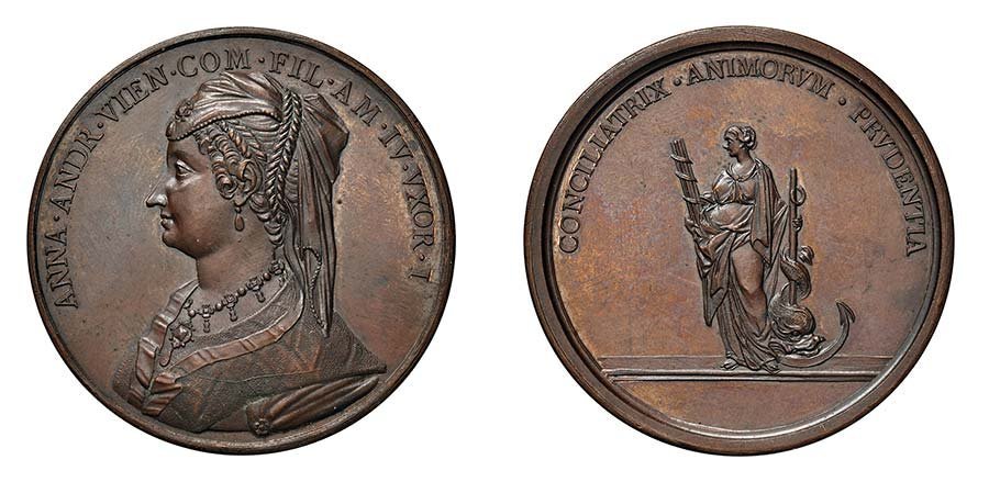 Anna di Borgogna -UdS26 Dritto: ANNA • ANDR • VIEN • COM • FIL • AN • IV • VXOR • I busto velato a sx con abito ricamato e collana con pendente figura allegorica femminile, in piedi di fronte con mantello, regge fascio e ancora | |