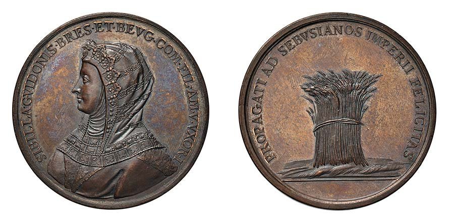 Sibilla di Baugnè -UdS34 Dritto: SIBILLA • GVIDONIS • BRES • ET • BEVG • COM • FIL • AM • V • VXOR • I busto a sx con velo ornato e perlinato Covone di spighe di grano | |