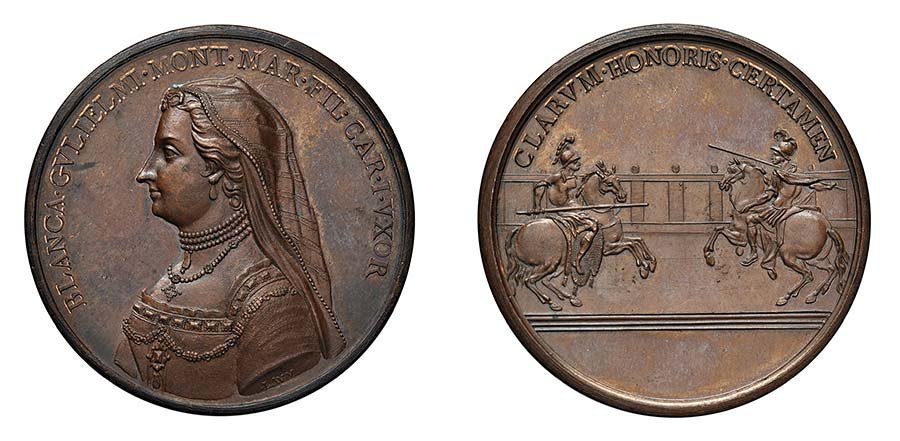 Bianca di Monferrato -UdS54 Dritto: BIANCA • GVGLIELMI • MONT • MAR • FIL • CAR • I • VXOR busto velato a sx con tre girocollo di perle e collana di perle sul taglio spalla: LAVY due cavallieri corazzati si affronteno in duello | |