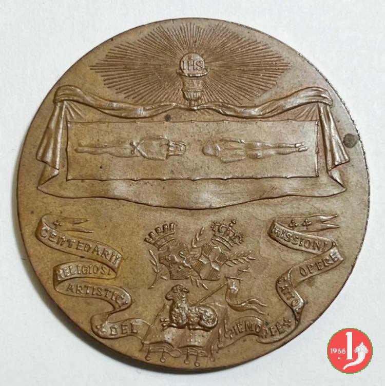Esposizione della Sindone 1898 Dritto: • CENTENARI • RELIGIOSI • ED • ARTISTICI • NEL • PIEMONTE • in alto: MDCCC XCVIII Veduta del Duomo di Torino sormontato dalla Sindone in basso: Agnello di Dio Croce raggiante su cui: IN HOC SIGNO VINCES quattro figure allegoriche della scultura, musica, pittura e architettura in esergo, entro targa: TORINO = MDCCCXCVIII sotto: JOHNSON - MILANO | |