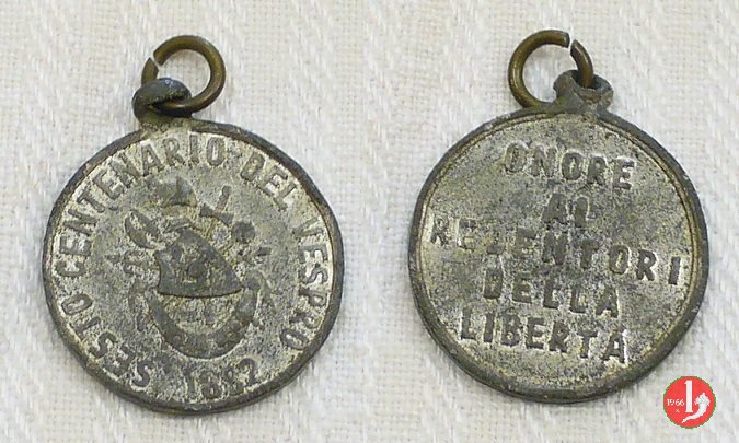 VI Centenario dei Vespri 1882 Dritto: SESTO CENTENARIO DEI VESPRI SICILIANI = • 1882 • cimiero, a sx, tra rami d'alloro, alabarda verticale e spade decussate | |