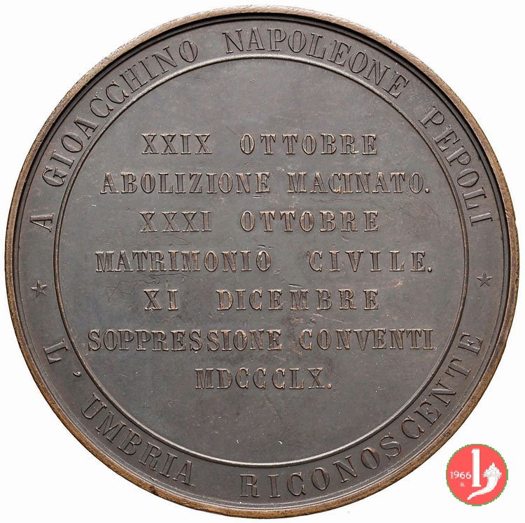 Gioacchino Napoleone Pepoli 1860 Dritto: testa a dx tra rami di quercia legati in basso da nastro sotto: F • VAGNETTI • nel campo, entro cerchio continuo: XXIX OTTOBRE = ABOLIZIONE MACINATO. = XXXI OTTOBRE = MATRIMONIO CIVILE. = XI DICEMBRE = SOPPRESSIONE CONVENTI = MDCCCLX. | |