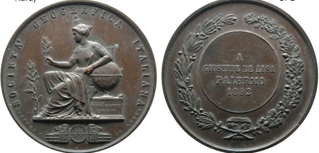 Società Geografica Italiana a Giuseppe De Lisa 1892 Dritto: SOCIETA' GEOGRAFICA ITALIANA figura allegorica dell'Italia turrita seduta a sx, regge ramo d'alloro e si appoggia a mappamondo in esergo: logo della Società Geografica Italiana in basso: PIERONI F. _ IN LUCCA | |
