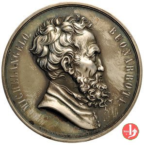 Verso: nel campo: FIRENZE = NEL IV CENTENARIO DI MICHELANGELO = PER UBALDO PERUZZI = SEPPE MOSTRARSI DEGNA = DEL DIVINO ARTISTA = MDCCCLXXV