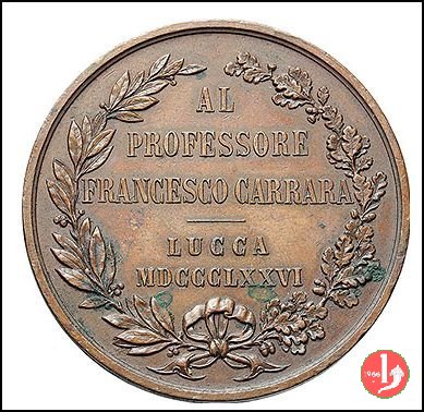 Verso: tra rami d'alloro e quercia legati in basso da nastro: AL = PROFESSOR = FRANCESCO CARRARA = - = LUCCA = MDCCCLXXVI