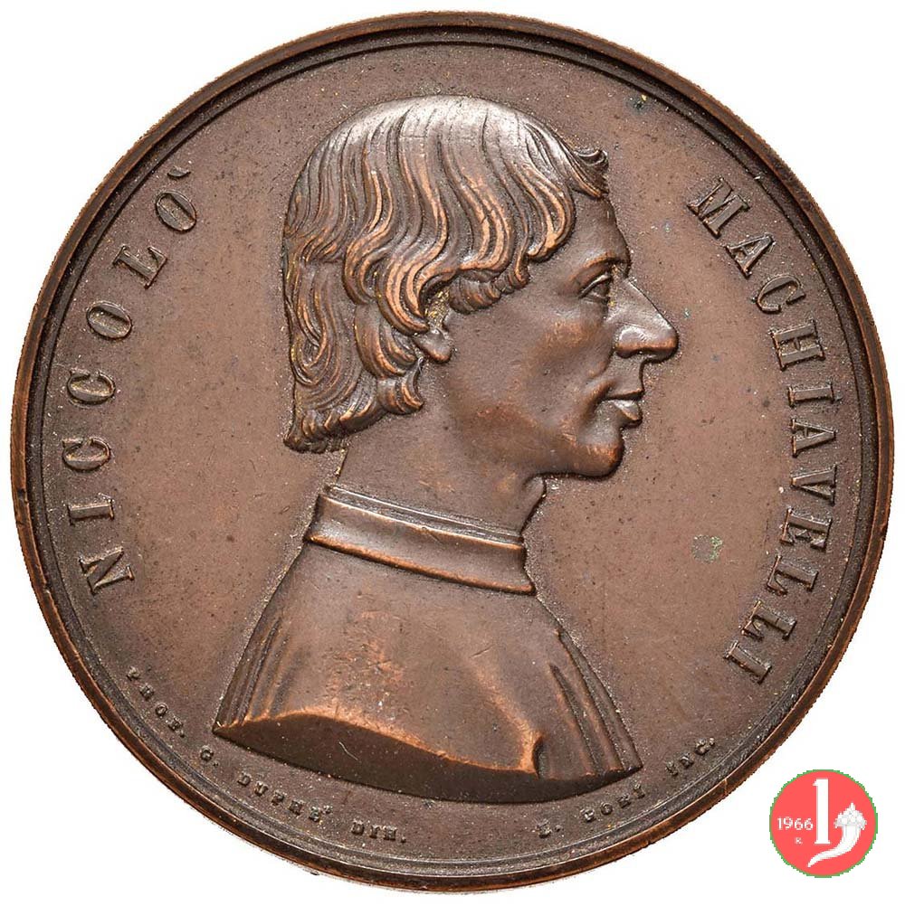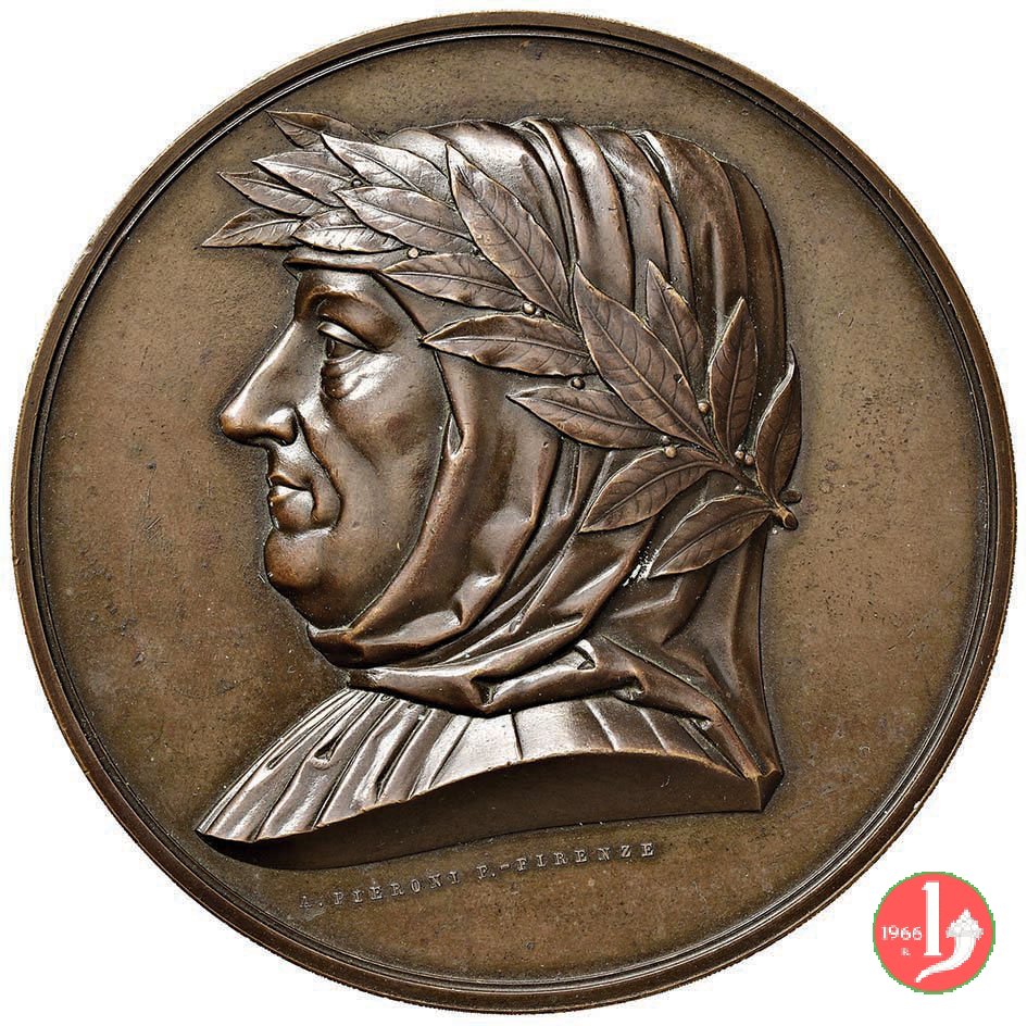 Verso: nel campo entro rami d'alloro legati da nastro in basso: PEL = QUARTO CENTENARIO = FIRENZE = - = MDCCCLXXV