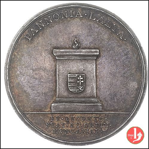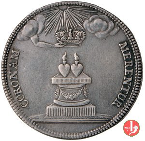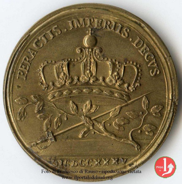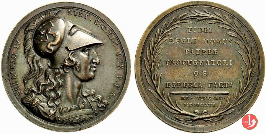 Verso: entro rami di palma legati da nastro in basso: FIDEI = REGIAE DOMVS = PATRIAE = PROPVGNATORI = OB = EGREGIA FACTA = - = AER • VULG • AN • = MDCCXCVI