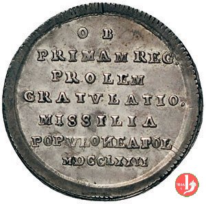 Verso: nel campo: ITALIA = SALUTA = VITTORIO EMANUELE = FERDINANDO = PRINCIPE DI NAPOLI = NATO = IL DI XI NOVEMBRE = - = MDCCCLXIX